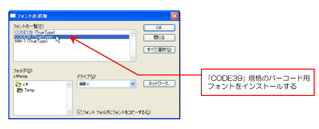 ※ここでは、ダウンロードした「CODE39.ttf」をCドライブの「Temp」フォルダに保存していることとします。