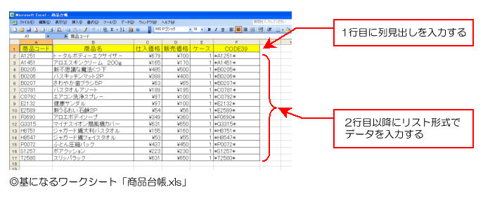 差し込み印刷を行うには、印刷時に参照するデータ(差し込むデータ)をあらかじめ作成しておく必要があります。これらのデータはWordで直接作成できるほかに、ExcelのワークシートやAccessのテーブルなどのデータも利用することもできます。ここでは、差し込み印刷時に参照するデータとして、次のようなExcelのワークシートを使います。この「商品台帳.xls」というワークシートは、次のようなルールに基づいて作成します。なお、このルールに該当していないと差し込み印刷を正しく行うことができないので注意が必要です。