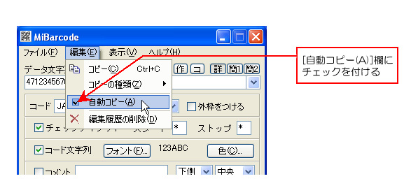 チェックしておくと、クリップボードを監視してデータがコピーされた場合に自動的にバーコードを作成するようになります。この機能は、自動コピーと組み合わせることで、データをコピーするとそのデータを基にしたバーコードがクリップボードに自動的にコピーされます。
