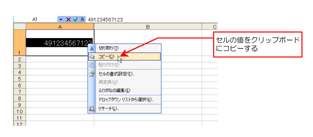 【手順3】選択したセルA1の値の上で右クリックし、[コピー(C)]を選択します(セルA1の値をクリップボードにコピー)。