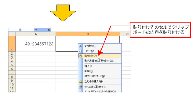 【手順4】貼り付け先となるセルB2の上で右クリックし、[貼り付け(P)]を選択します。これにより、クリップボードに作成されたバーコードの画像データがセルB2に貼り付きます。