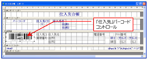 「詳細」セクションの左端には、「仕入先コード」フィールドの値をコントロールソースにした「仕入先」バーコードコントロールを配置して、次のようなプロパティを設定しています。ここでは、「CODE39」規格のバーコードを表示させるために[スタイル(S)]には「6-Code-39」を指定します。