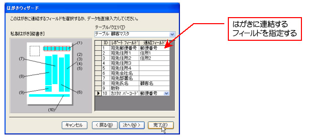 ・はがきに連結するフィールドを次の図のように指定して、[完了(F)]ボタンをクリックします。