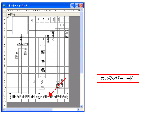上記の操作を行うと、次のようなレイアウトのハガキのレポートが作成されます。レポートに挿入されたカスタマバーコードは、通常のバーコードコントロールと同様に位置やサイズを変更したり、各種のプロパティを変更することができます。作成された直後のカスタマバーコードには、初期設定で次のようなプロパティが設定されています。